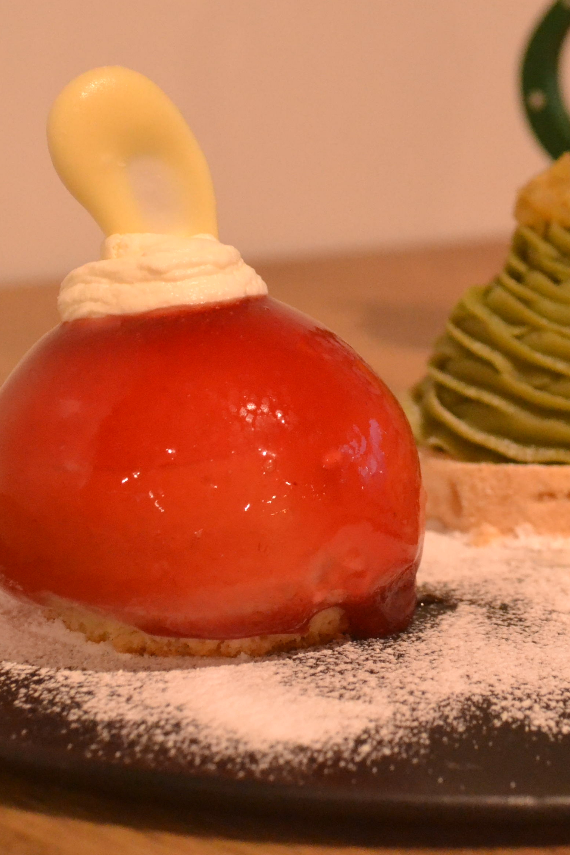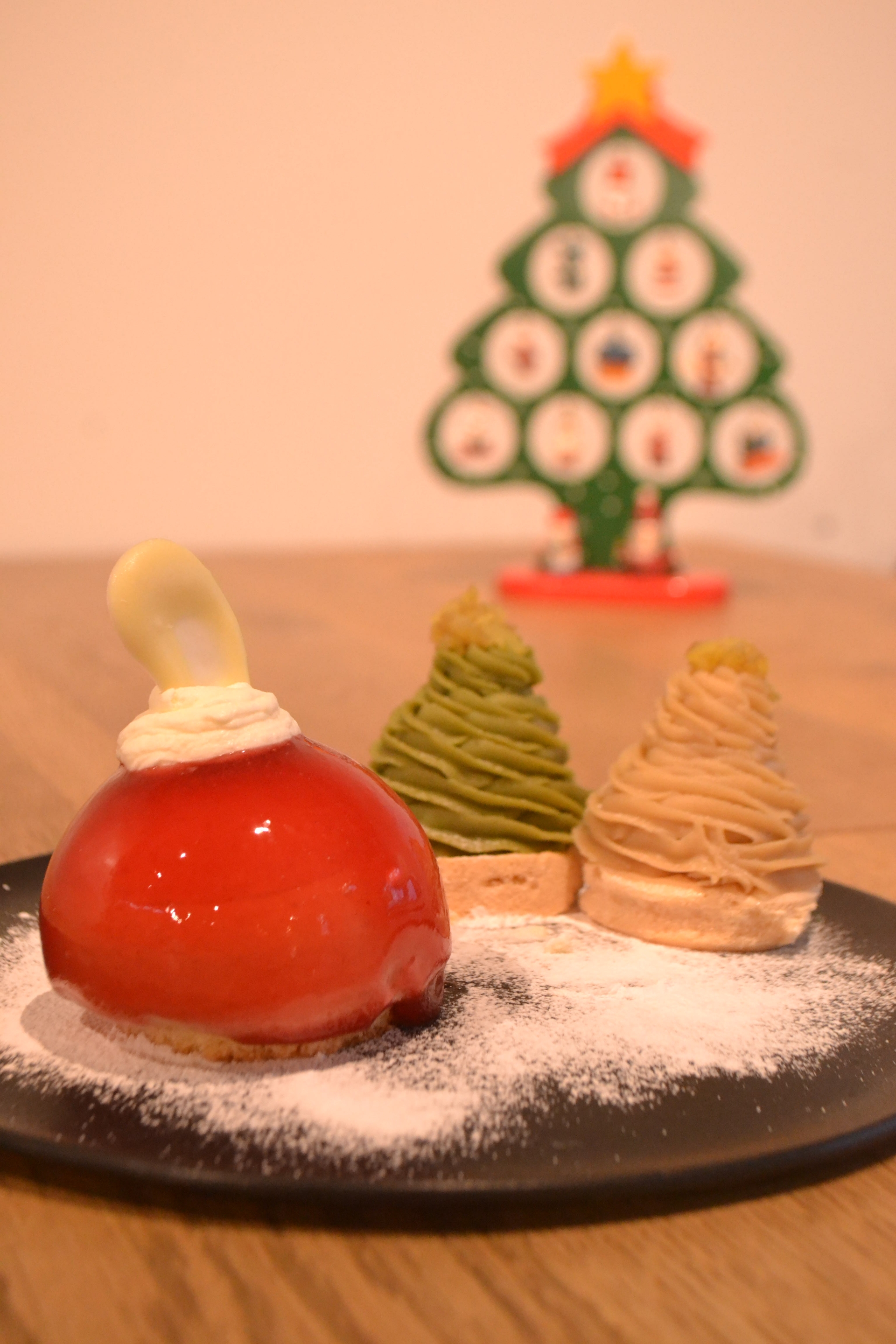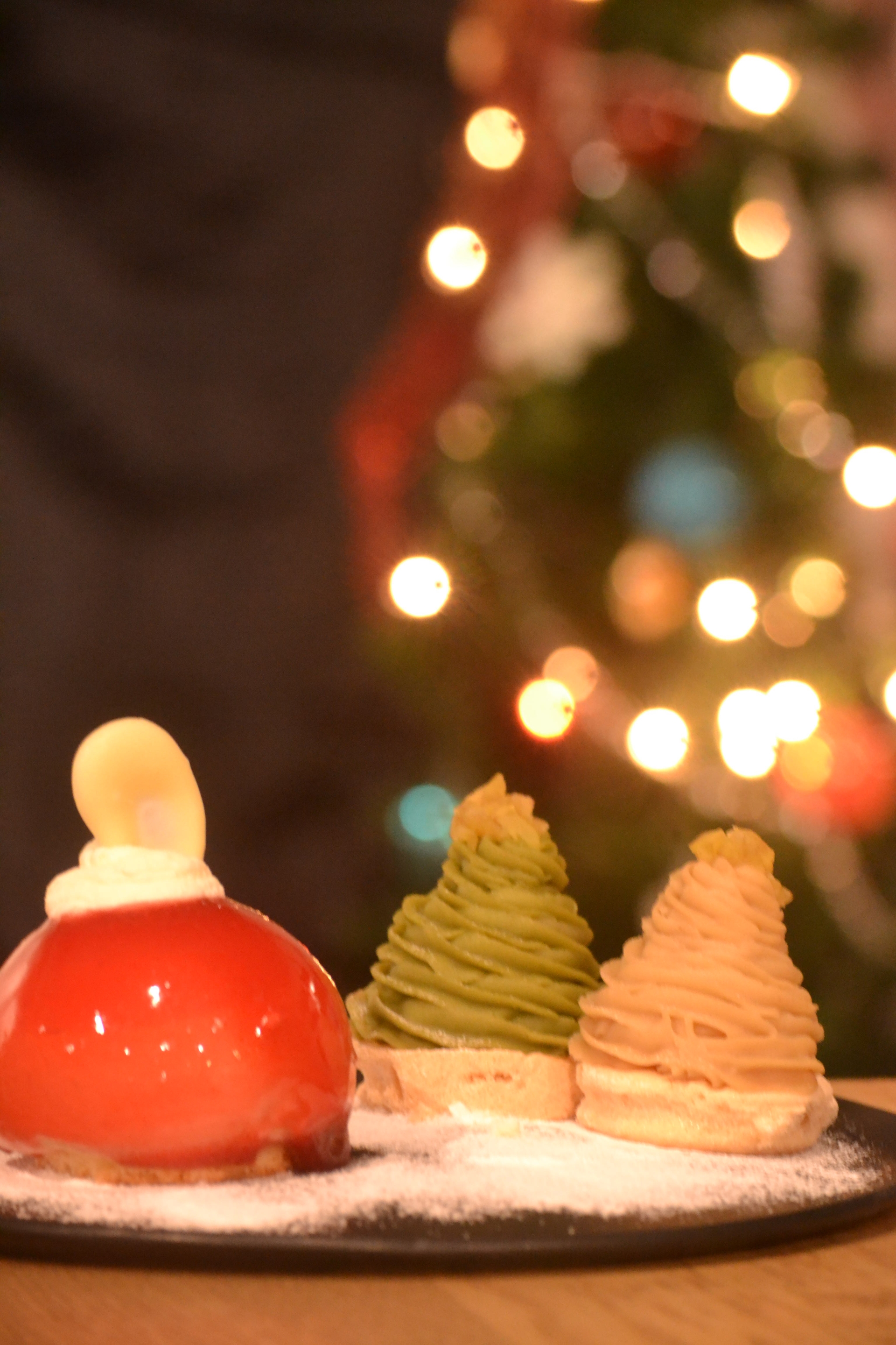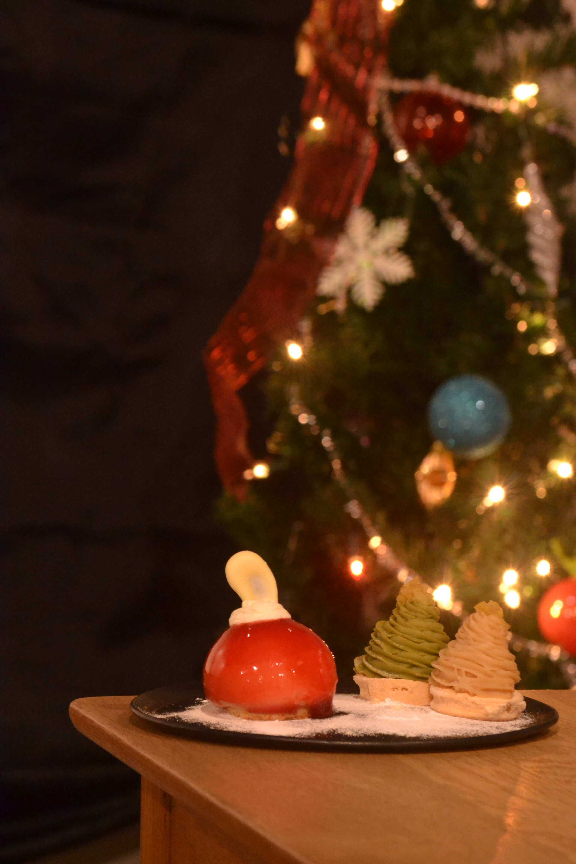 12月限定『ヒガシチュー・ド・ノエル』登場。きらめくクリスマスを彩る、オーナメントムースと2種のモンブランツリーがひとつのプレートになった、季節限定の華やかなデザートです。
