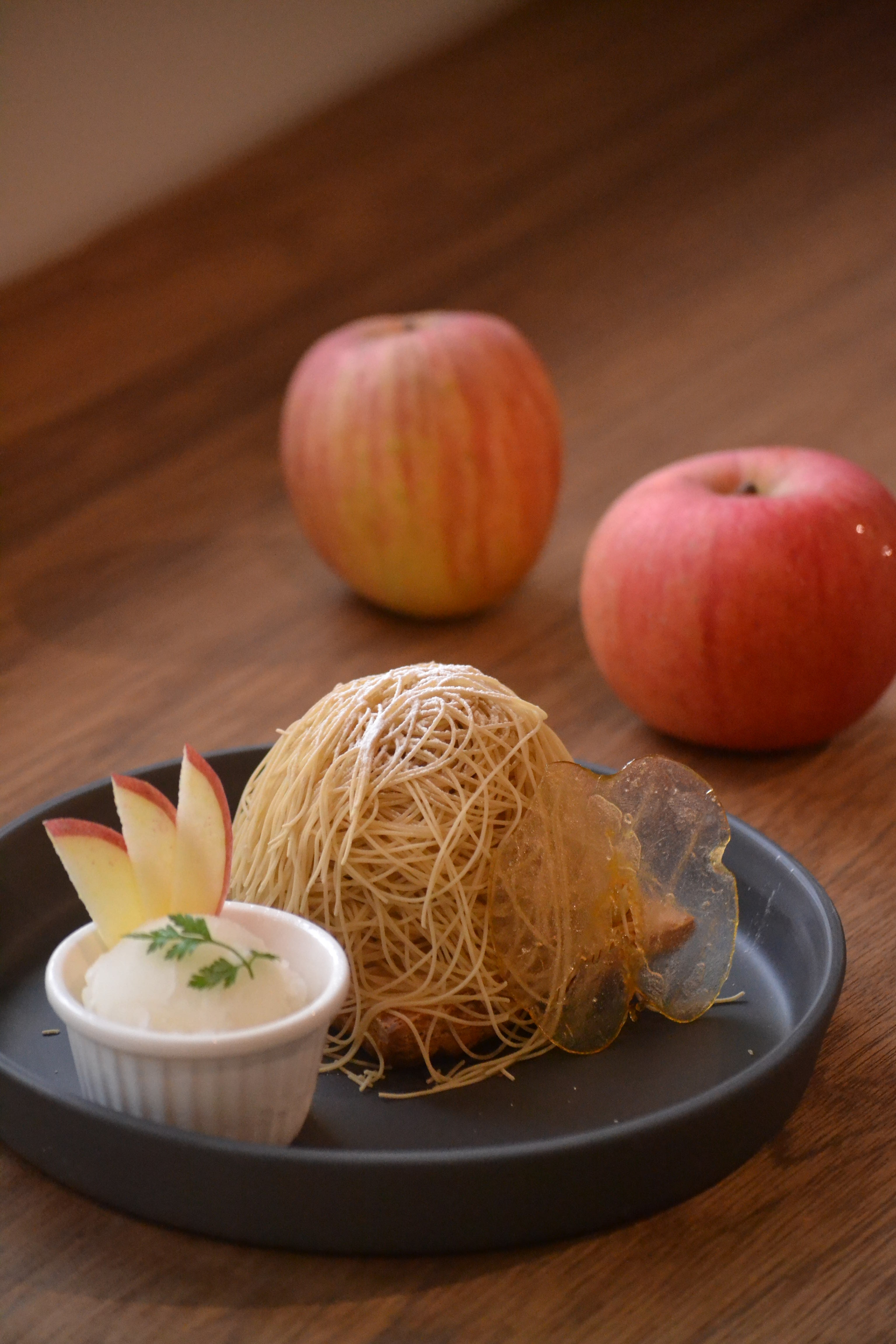 サクッ、とろり、なめらか——食感の変化も魅力のひとつ。口直しには爽やかなりんごのシャーベットをご用意しました。